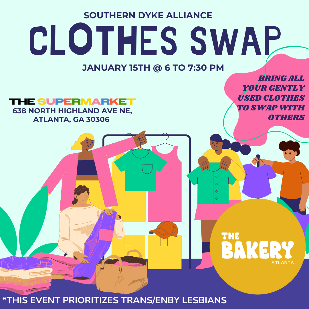 The Southern Dyke Alliance (SDA) is hosting a community clothes swap in partnership with The Bakery Atlanta! Bring gently used clothing and accessories to trade, or just come to connect and browse. This event is a space to refresh your wardrobe while supporting sustainability and community care. Let's celebrate each other's unique styles while creating a welcoming and affirming environment for everyone.